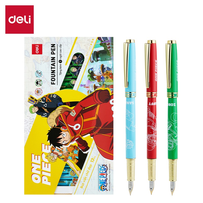 Bút máy One Piece Deli CQ897O là lựa chọn tuyệt vời cho những ai yêu thích bộ truyện tranh One Piece. Thiết kế nổi bật với ba màu sắc cá tính: đỏ, xanh lá, xanh dương, kết hợp hình ảnh các nhân vật Luffy, Zoro, Sanji mang đến phong cách trẻ trung và đậm chất sưu tầm. Thân bút được làm từ hợp kim và nhựa ABS cao cấp, đi kèm cài bút mạ vàng sang trọng, bền bỉ và chắc tay khi cầm. Bút sử dụng ngòi EF 0.38mm, cho nét chữ thanh mảnh, trơn tru, không lem mực, thích hợp cho ghi chép, ký tên hay luyện chữ.