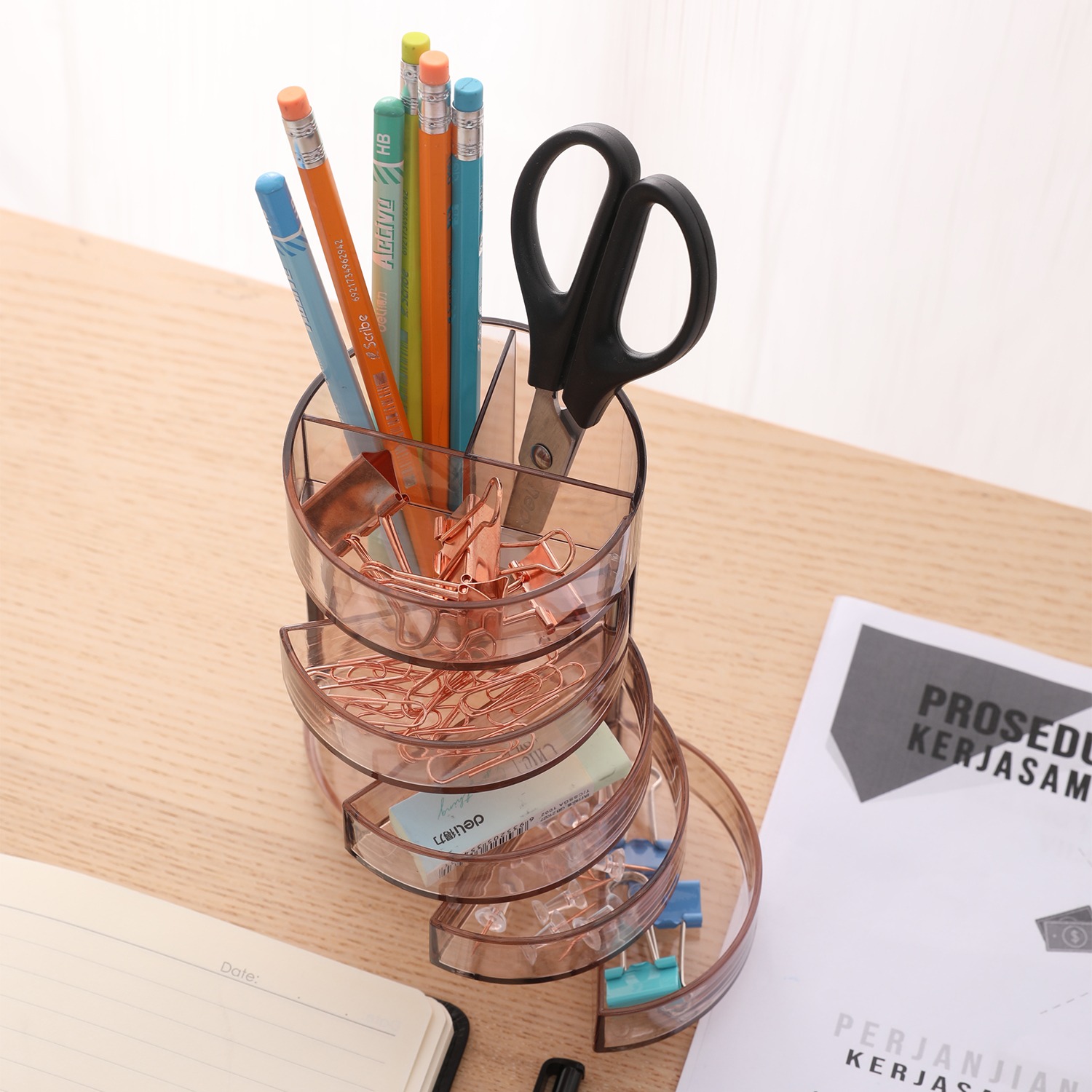 Một trong những ưu điểm nổi bật của Cắm Bút Nhựa Deli E906 chính là thiết kế 2 ngăn lớn phía trên để cắm bút, kéo, thước kẻ và 4 ngăn kéo tầng xoay tiện lợi ở thân dưới.