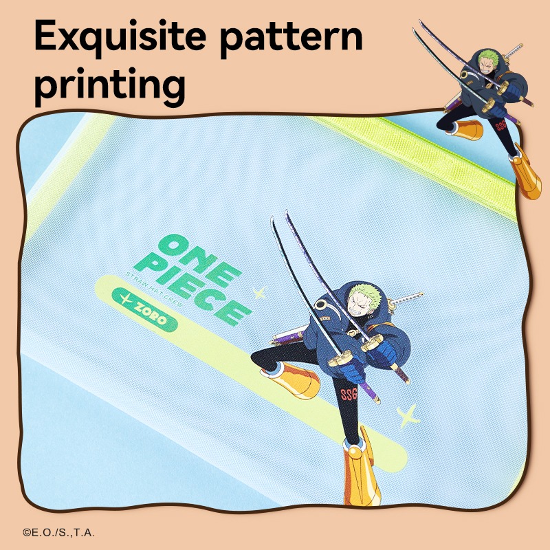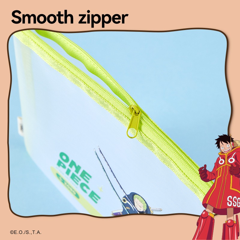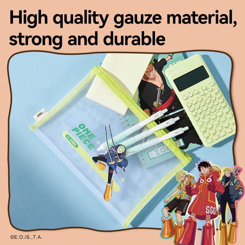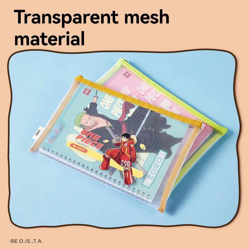 Điểm nhấn đặc biệt của Túi lưới đựng tài liệu A5 Deli EF288 chính là hình in nhân vật One Piece – bộ manga/anime nổi tiếng toàn cầu. Với hình ảnh Luffy, Zoro và những họa tiết độc quyền, túi lưới A5 Deli EF288 mang lại cảm giác trẻ trung, năng động, phù hợp cho các fan hâm mộ One Piece.