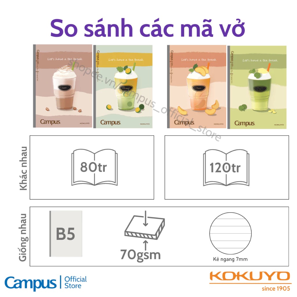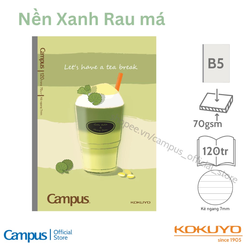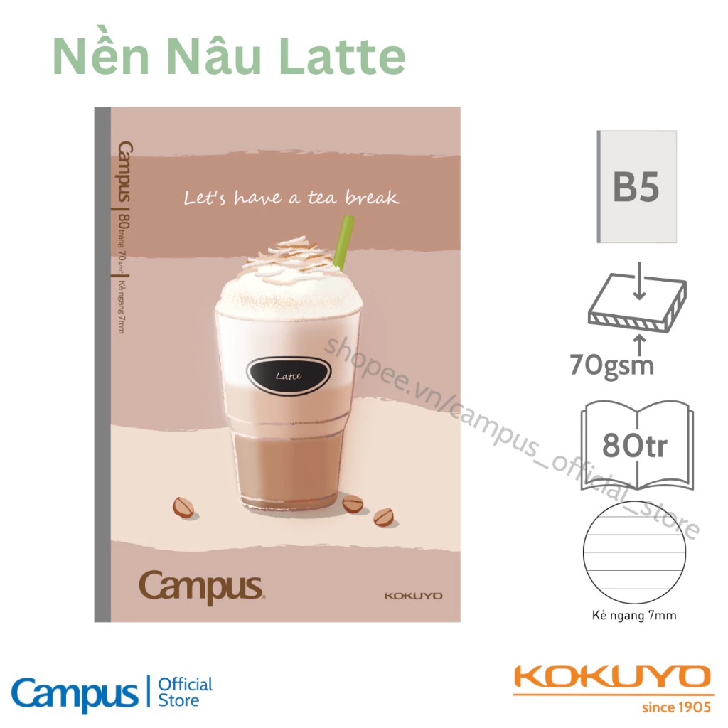 Vở kẻ ngang Café Campus là dòng vở cao cấp đến từ thương hiệu Kokuyo Nhật Bản, lấy cảm hứng từ ly cà phê ngọt ngào, mang lại cảm giác thư giãn và sáng tạo khi ghi chép. Sản phẩm có hai lựa chọn 80 và 120 trang, giấy 70gsm mịn, không lem mực, kẻ ngang 7mm rõ ràng giúp viết đẹp, trình bày dễ dàng. Khổ B5 tiện dụng, bìa in hình trà sữa, cà phê, matcha hiện đại, phù hợp với học sinh, sinh viên và dân văn phòng. Vở Café Campus là lựa chọn hoàn hảo cho những ai yêu thích sự tinh tế, năng động và chất lượng Nhật Bản trong từng trang giấy.